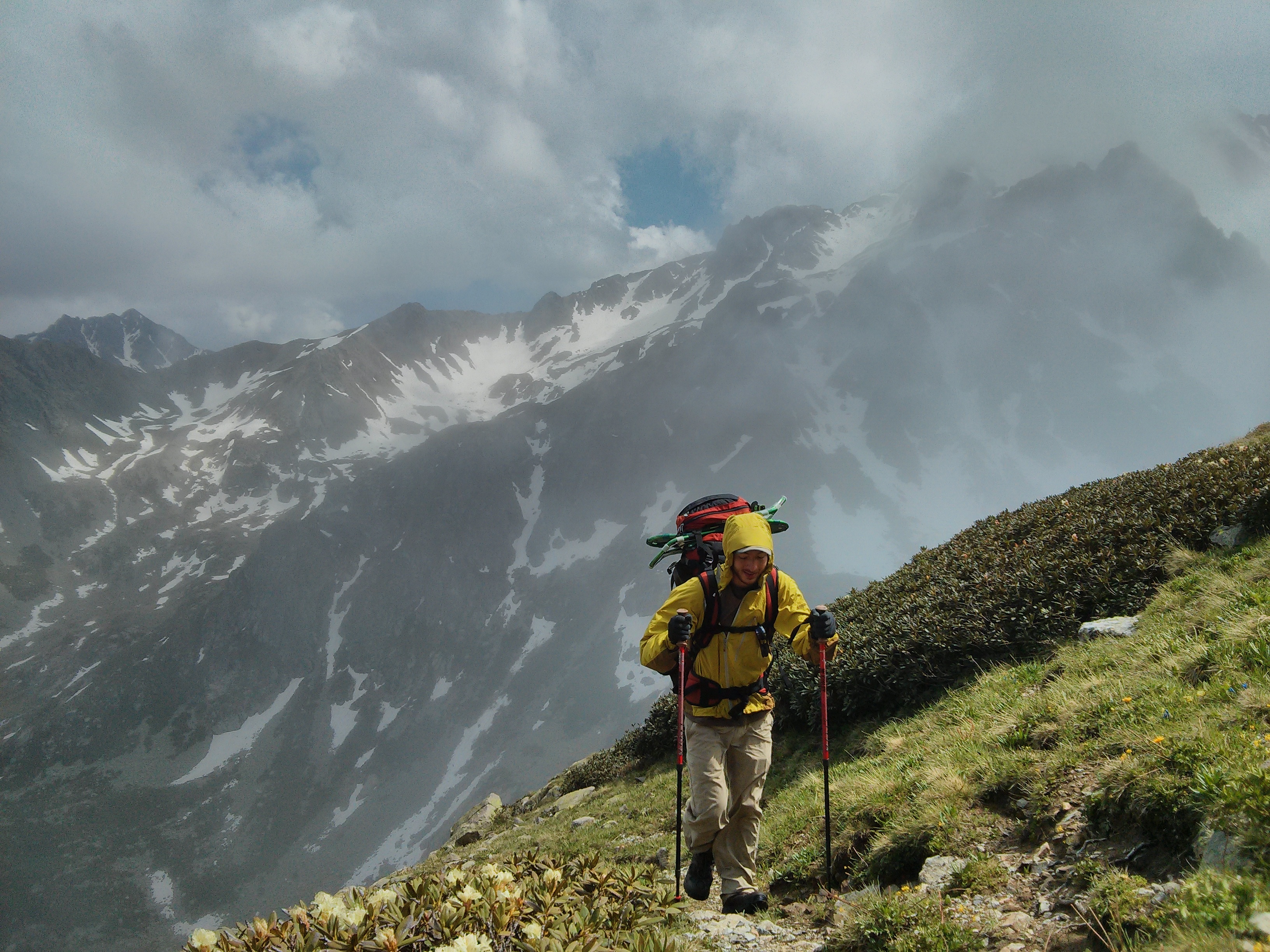 While the first peak saw me swearing at a bank of snow, and possibly being a bit unnecessarily frosty with Josh, the ones after that each got easier. The last is the post I indicated above, but the second last was possibly the most rewarding. Dredging up a grassy hill under the burning sun, we came over a windswept pass, in view of several snow-capped peaks, to see a giant mountain lake only hundreds of meters below. Better yet, it had a nice snowy ramp to slide down into it. While caution precluded some possibilities, I will never be able to explain how I did not think in that and other moments not to use my sleeping mat as a make-shift snow sled. Possibly the weight of the 70 litre bag I had on, and the speed I could reach, and the possibility of being submerged in icy cold glacial water, all made that a non-starter. Regardless, once the packs were safely on the lakeside ground, the water made for the most rewarding and welcome icy splash I had had in any trip of my memories. Good times.
